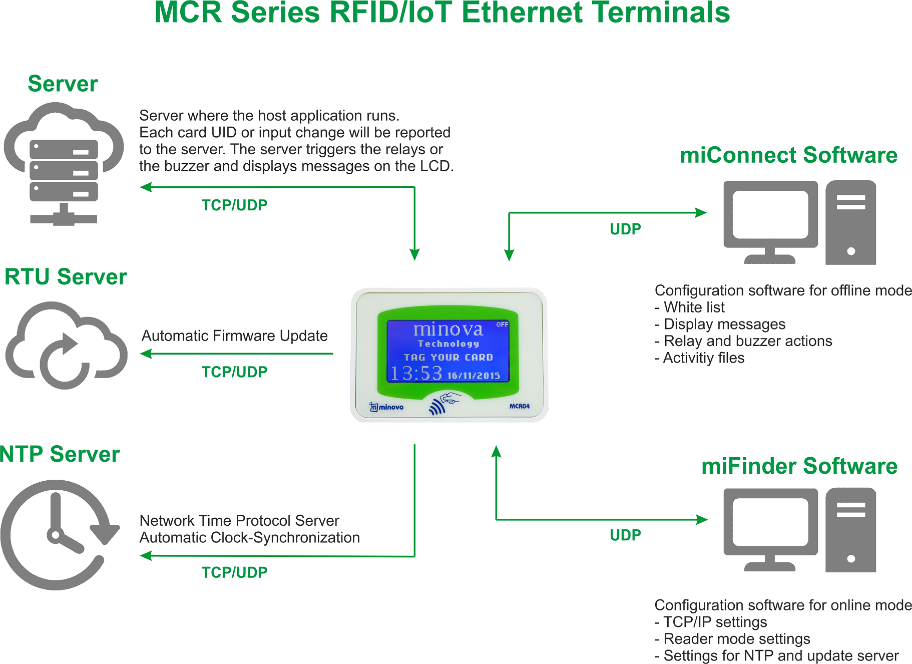 MCR0X series contactless card readers are MIFARE® standard devices with all read-write capabilities with graphical LCD screen and Ethernet connection. Device can query a contactless card’s unique ID from a remote database equipped with web server with built in HTTP web service client functions and can retrieve LCD texts, audible alert commands or relay output commands as a response from the web service.