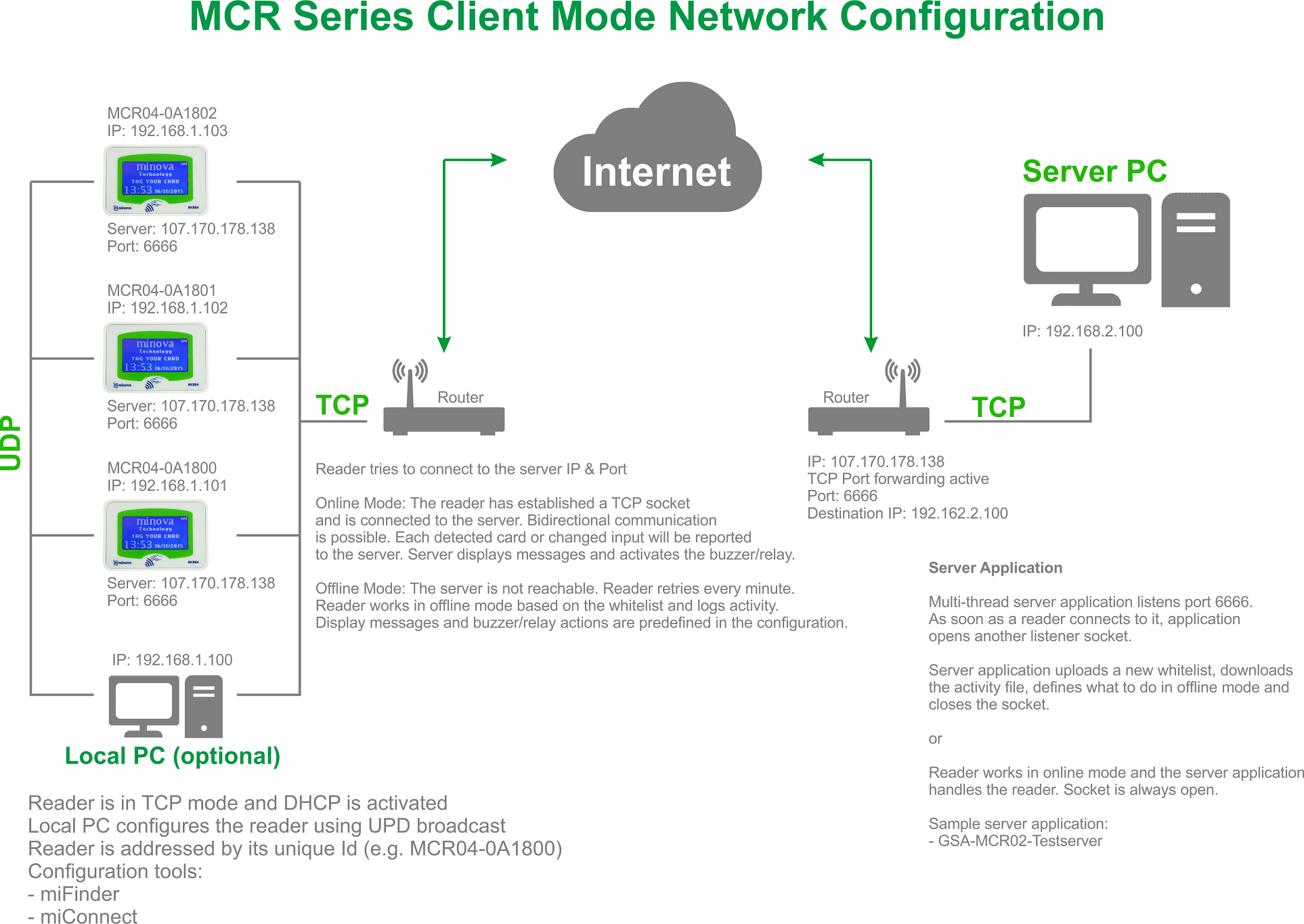 miFinder software is available for setting and reading all the parameters of any number of units connected to local area network. miFinder discovers devices by UDP without any prior knowledge of IP or MAC addresses. MCR units may get alias naming with miFinder which makes management easier with large number of readers in buildings or campuses. The software can be downloaded from here or you can download from product links section. For more information please refer to the product datasheet.
